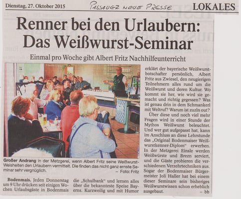 Tauchen Sie mit uns ein in die „Welt der Weißwurst“. Ein spannendes Seminar über die bekannteste Speise Bayerns. Das besonderes Erlebnis für Feriengäste und Einheimische mit zünftigem Weißwurstessen.